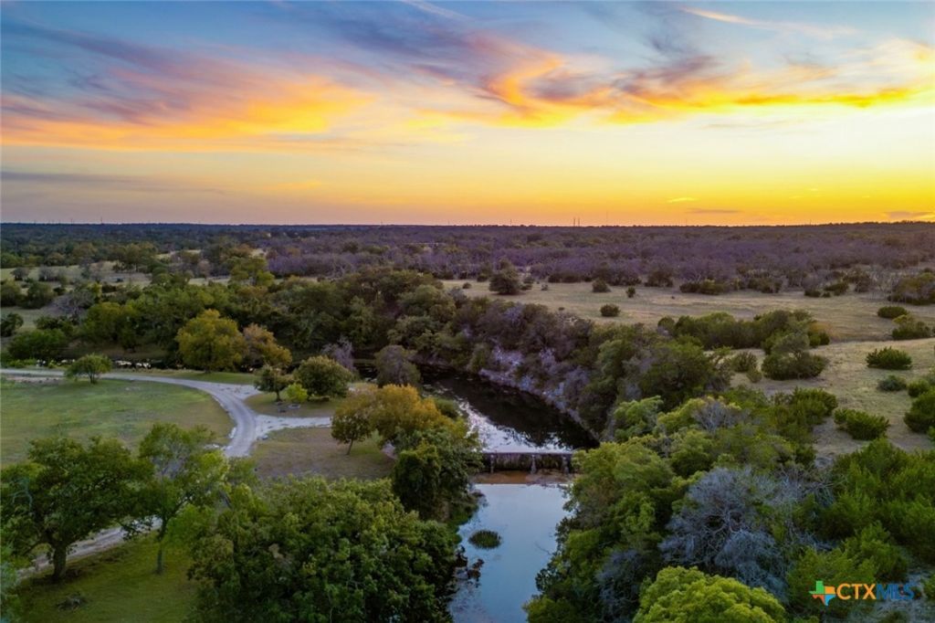 Experience the best of both worlds on this stunning 28.15-acre live water ranch, where serene Hill Country views meet refined comfort. The main house rests under tall oaks near creekside bluffs, w/ features like wrought iron doors, hand-hewn cedar beams, vaulted ceilings, rich woodwork, multiple fireplaces. The open-concept kitchen boasts a large island, high-end appliances, & a walk-through butlers pantry. Step onto the vaulted, cedar-beamed patio & expansive stone terrace overlooking the creek?ideal for peaceful mornings or lively gatherings. A standout feature is the indoor/outdoor firepit room with floor-to-ceiling gas firepit, recessed wet bar, wine cooler, mini fridge, & built-in grill. A full wall of sliding glass doors opens to the outdoors, transforming the space for any occasion. Nearby, the game house offers a living area, full bath, cedar bar, built-in kegerator, & room for games or guests. At the far end of the property sits a 90x74' steel building w/ five 12x10 garage doors, HVAC living space, kitchenette, & bath?great for guests, caretakers, or income. The barn includes 14 covered bays, RV/equipment storage, & hookups. Located in the high-end gated Maverick community, enjoy a clubhouse, pool, sport courts, trails, Blue Hole access, paved roads, fiber internet, high-fenced perimeter, & more. Smaller acreage options: Lot 22 (10.57± acres), Lots 21+22 (16.2± acres).