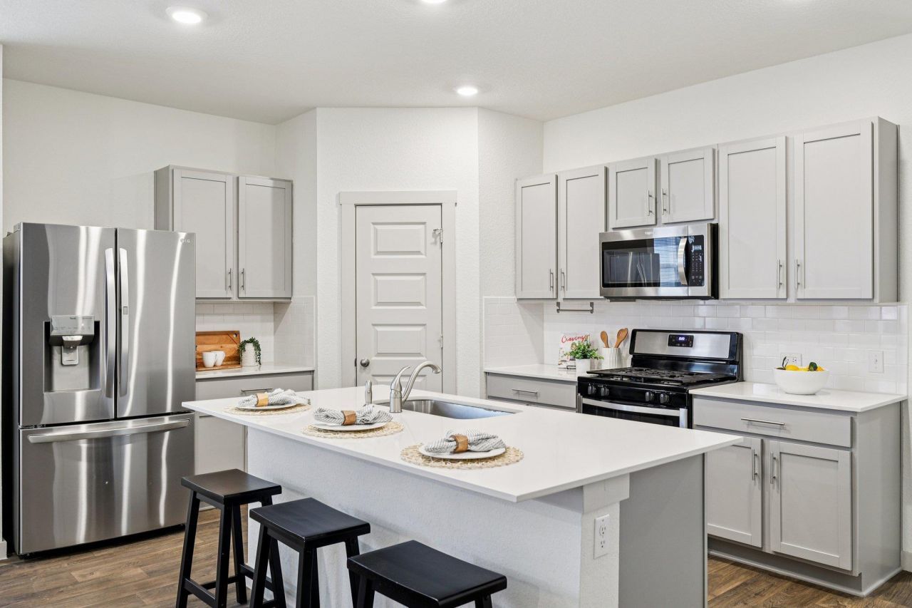 Why wait for new construction when perfection is ready right now? Built in 2021 and meticulously maintained, this 4 beds 3 baths residence in Mustang Creek outshines new construction with over $10,000 in premium upgrades and a highly functional layout designed for modern living. The property sits on a premium lot with no rear neighbors, ensuring a quiet, private atmosphere that is difficult to find in this price range. As you step into the foyer it opens into a luminous, open-concept great room where natural light pours in through large windows. The gourmet kitchen serves as the heart of the home, featuring a massive quartz center island with bar seating, gray cabinetry, and stainless steel appliances. The open layout connecting the kitchen, dining, and living zones makes entertaining effortless. A dedicated home office is positioned near the entry, creating a quiet workspace. Uniquely designed with two full bedrooms on the main level, this home offers unmatched versatility. The private Primary Suite showcases a spa-inspired bath with a double vanity, walk-in shower, and generous walk-in closet. A second main-floor bedroom and full bath offer ideal guest or multi-generational accommodations. Upstairs, a colossal loft space awaits, ready to serve as a home theater, game room, or teen retreat, flanked by two additional spacious bedrooms and a third full bathroom. Outside, the custom screened-in back patio serves as a true extension of the living space, allowing for year-round enjoyment of the fresh air. Significant value-added enhancements include a top-of-the-line Maytag whole-home water softener and filtration system, upgraded ceiling fans in every room, and custom laundry room cabinetry. A comprehensive security suite with glass break sensors and four exterior cameras conveys with the sale. Residents of Mustang Creek enjoy a quiet community atmosphere just minutes from Hutto Elementary, the 130 Tollway, and the Hutto Co-Op District.