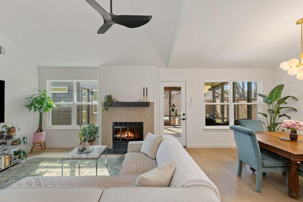 Located in the heart of Southwest Austins Maple Run neighborhood, this 3-bedroom, 2-bath home was remodeled in 2025 by Pesoli Properties with thoughtful design and elevated finishes throughout. Soaring ceilings, abundant natural light, and wood floors in the main living area create an open, airy feel, while the fireplace adds warmth and character. The kitchen features a beautiful tile backsplash, stainless steel appliances, and bar seating, flowing seamlessly into the dining and living area for entertaining. Two bedrooms are located on the main level, and the primary suite is privately tucked away on the second floor. Offering a quiet retreat separate from the rest of the home, the space features high ceilings, wood floors, a walk-in closet, and a spa-like ensuite bath with a double vanity, walk-in shower, and soaking tub. Stepping outside, the backyard is designed for health and wellness and entertaining alike, featuring a screened-in porch, attached sauna, outdoor shower, and a cowboy pool. A detached studio with a mini-split provides flexible space for a home office, gym, yoga studio, or guest overflow. Set on a charming, tree-lined street in Maple Run and just minutes from South Austins shopping, dining, and entertainment, this home delivers standout indoor-outdoor living in a highly desirable location.Stepping outside, the backyard is designed for health and wellness and entertaining alike, featuring a screened-in porch, attached sauna, outdoor shower, and a cowboy pool. A detached studio with a mini-split provides flexible space for a home office, gym, yoga studio, or guest overflow. Set on a charming, tree-lined street in Maple Run and just minutes from South Austins shopping, dining, and entertainment, this home delivers standout indoor-outdoor living in a highly desirable location.