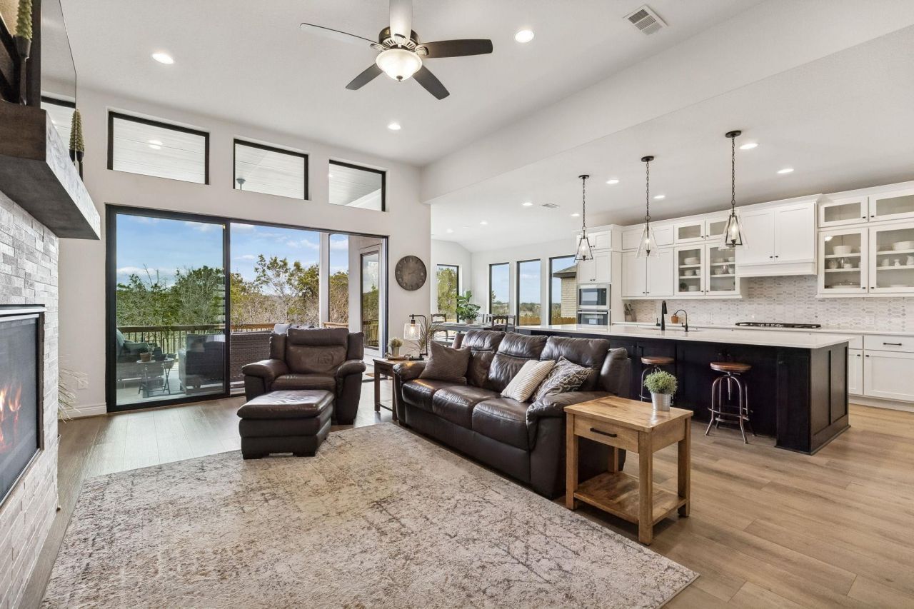 Welcome to this exceptional, better-than-new single-story Perry Home in the highly sought-after La Cima neighborhood. Thoughtfully designed and meticulously maintained, this stunning residence offers 2,895 square feet of beautifully curated living space with soaring ceilings and an open, airy feel throughout. Featuring 4 bedrooms and 4 bathrooms, the layout is ideal for both everyday living and entertaining. A versatile flex space just off the living room is perfect for a media room, playroom, or office and is already wired for surround sound. The heart of the home is the impressive kitchen, showcasing stainless steel appliances, floor-to-ceiling white cabinetry with glass-front uppers, quartz countertops, and a large island with ample storage and seating. An alkaline water dispenser at the sink adds an elevated touch. The kitchen opens seamlessly to the spacious living room, highlighted by beamed ceilings and a cozy fireplace. Tucked privately at the back of the home, the primary suite offers peaceful views through large picture windows without harsh sun exposure. The ensuite bath features dual vanities, an oversized soaking tub, and a separate walk-in shower. One secondary bedroom includes its own ensuite bath?ideal for guests or multigenerational living?while two additional bedrooms share a Jack-and-Jill bathroom. A convenient guest half bath completes the interior. Expansive sliding glass doors lead to an oversized covered porch, creating inviting indoor-outdoor living. With private property behind, youll enjoy beautiful views and no rear neighbors. The fully landscaped exterior includes trim lighting with a lifetime warranty. The three-car garage features epoxy flooring with a lifetime warranty, plus a water softener and whole-house filtration system. Located in a community with resort-style amenities including a pool, trails, parks, playgrounds, fitness center, and clubhouse, this move-in-ready home offers luxury, comfort, and exceptional lifestyle living.