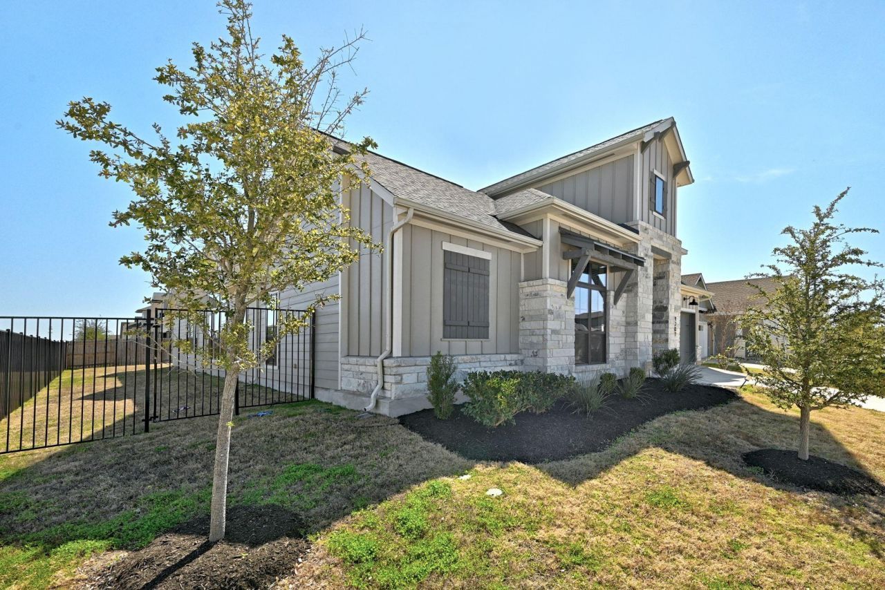 Easton Park single-story home for lease, 4 bedrooms, 3.5 bathrooms, dedicated office, on a corner lot in one of Southeast Austins most amenity-rich communities with trails, parks, and a resort-style pool. This Easton Park home pairs an easy one-story layout with high ceilings, luxury vinyl plank flooring, and a wide-open living, kitchen, and dining space. The living room stretches across the back of the home with a full wall of windows, keeping the space bright from morning to evening and visually connected to the covered patio and backyard. The kitchen sits squarely at the center of it all, built around a large island with breakfast bar seating, quartz countertops, a gas cooktop, double ovens, and substantial storage that keeps everything within reach. The dining area is wrapped in windows, creating a light-filled spot that works equally well for quiet mornings or full tables. Just off the main living area, glass french doors lead into a spacious dedicated office, offering a true work-from-home setup. The primary suite is set apart from the secondary bedrooms and is notably large, with a vaulted ceiling and enough room for a full furniture layout plus a sitting area, desk, or exercise setup. The spa-like ensuite bath includes separate vanities, a soaking tub, walk-in shower, and a walk-in closet that will fit all of your clothing and accessories. Three additional bedrooms, a full bathroom and a jack and jill bathroom provide options for guests or flexible use. Outside, the covered patio opens to a private backyard, while the corner lot provides extra breathing room. Living in Easton Park means access to more than 13 miles of trails, multiple parks and playgrounds, dog parks, a resort-style pool, fitness center, gaming lounges, coworking and conference rooms, yoga lawn, and an on-site coffee bar. Easton Parks Southeast Austin location places TESLA, the airport, Downtown Austin, McKinney Falls State Park, and Circuit of the Americas all within a short drive!